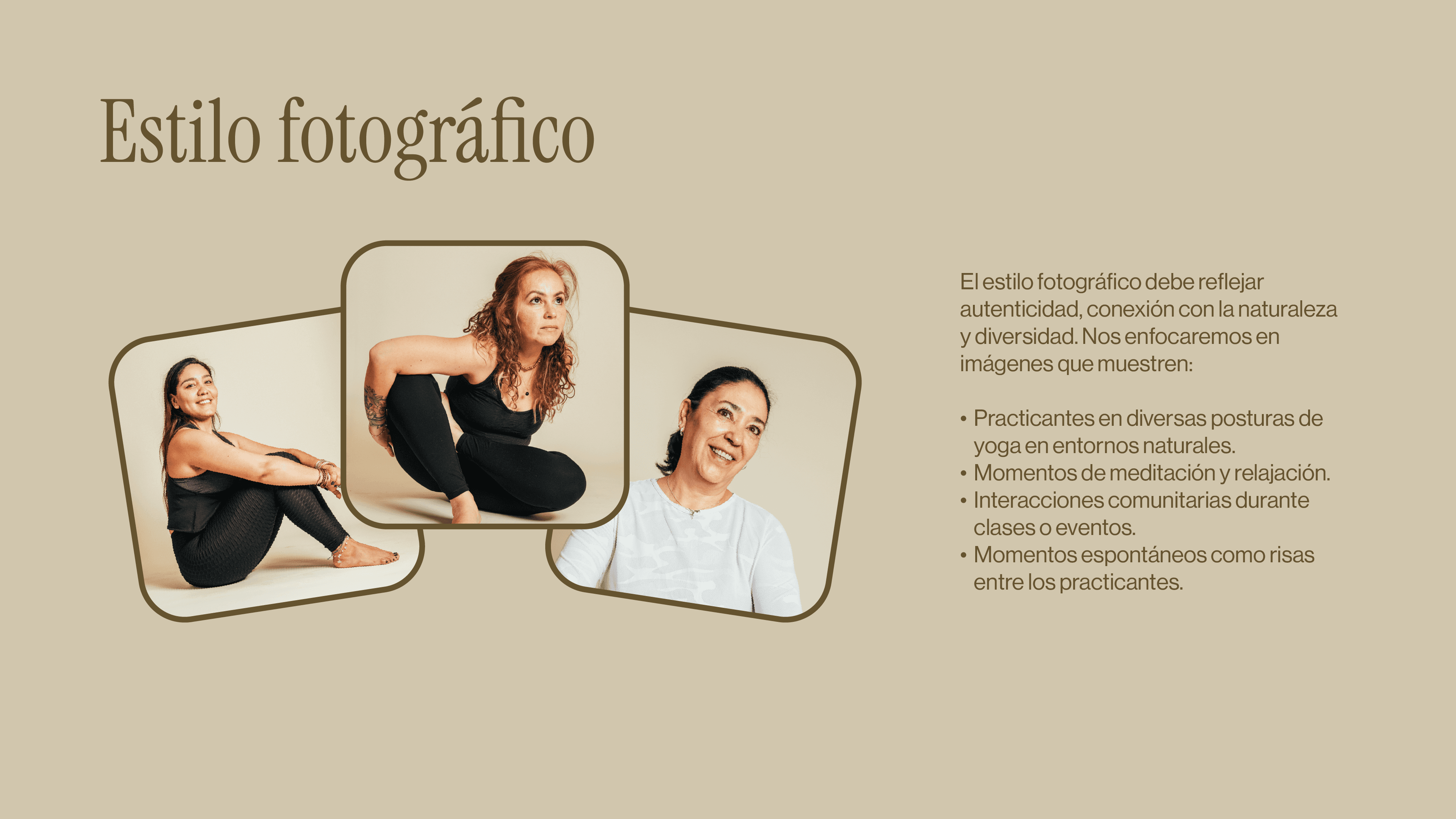 Definimos una línea visual basada en la autenticidad y la conexión con la naturaleza. Las imágenes priorizan momentos reales, diversidad de cuerpos y la práctica del yoga en escenarios naturales.