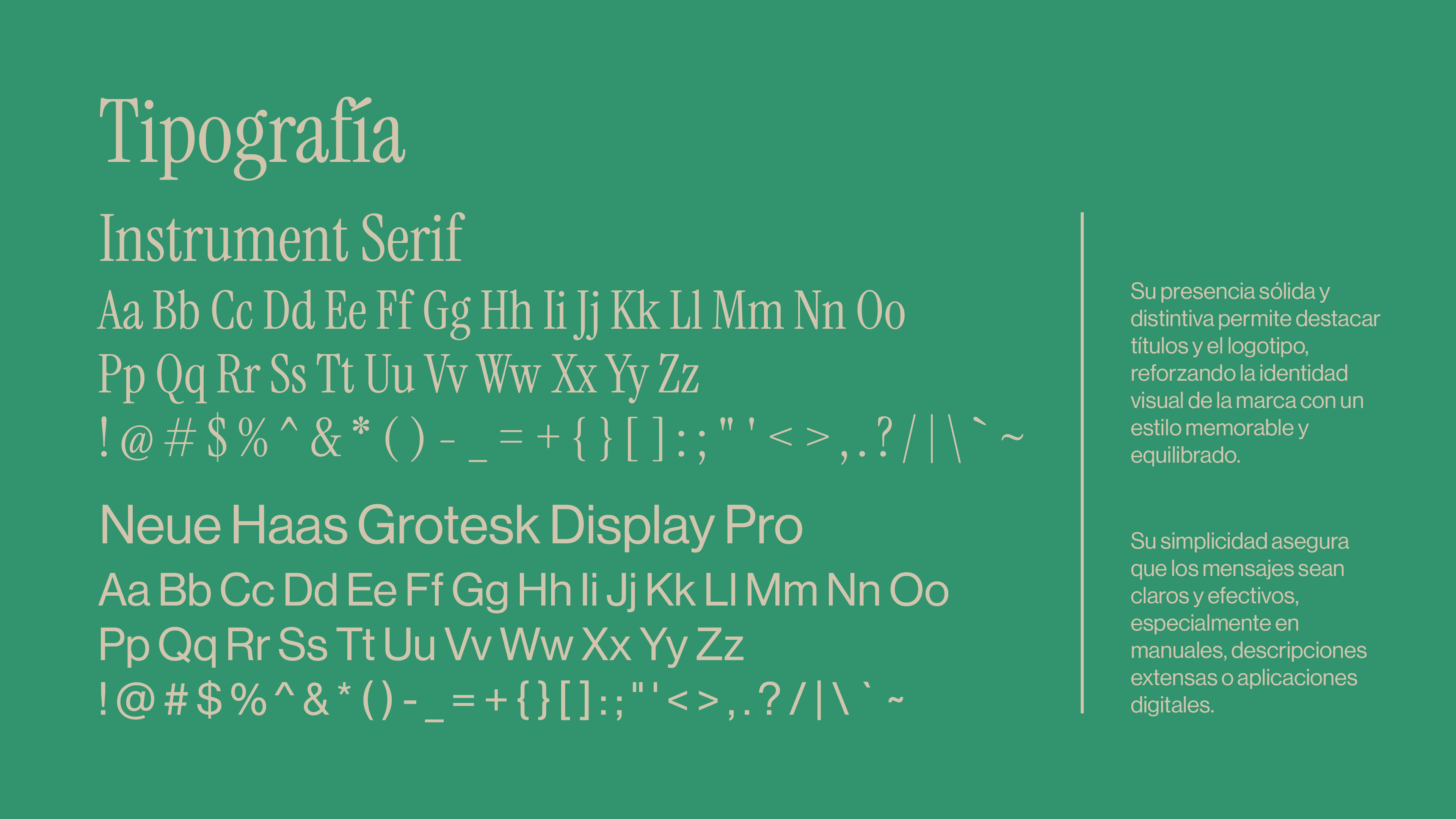 Integramos una tipografía serif con carácter confiable y una sans serif clara y versátil. Esta combinación refuerza la dualidad entre tradición y modernidad, clave para una comunicación equilibrada.